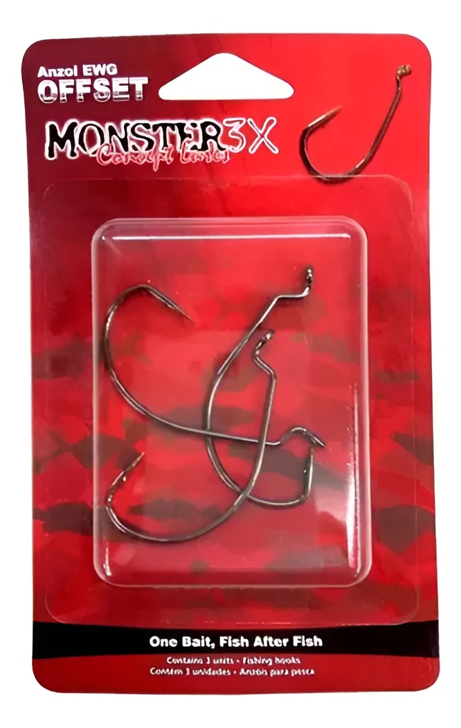 Pelo seu modelo EWG mais curvado, o pescador tem sempre uma fisgada perfeita. Com o uso do anzol correto nos modelos da Monster 3X, você vai conseguir vários trabalhos diferentes com a mesma isca, alternando desde a superfície até a meia água. Anzol offset EWG em aço carbono reforçado, super resistente, com liga metálica, ideal para pescarias com as iscas Monster3X.