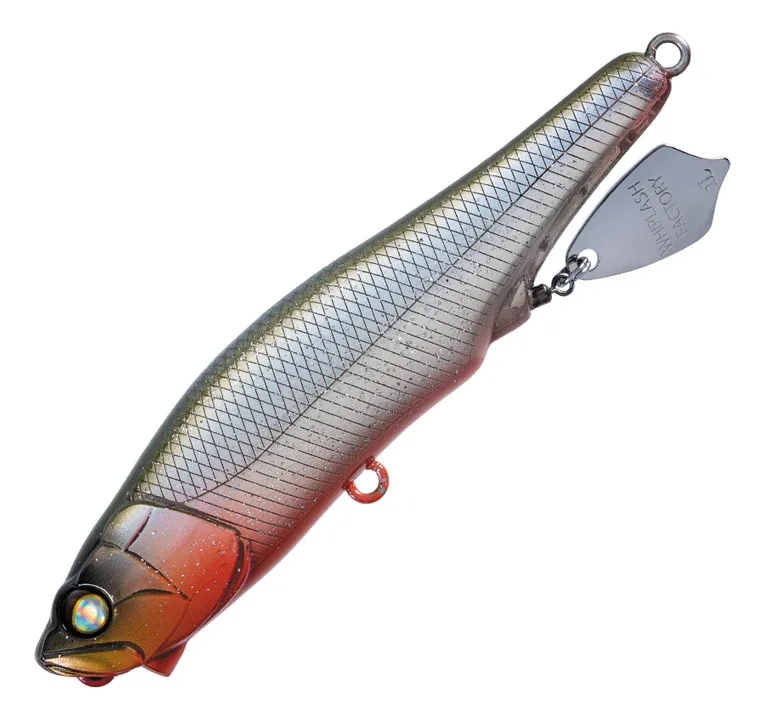 A lâmina giratória na barriga (wire blade) - gera flashes e vibrações no topo d’água, estimulando os peixes por som e luz.